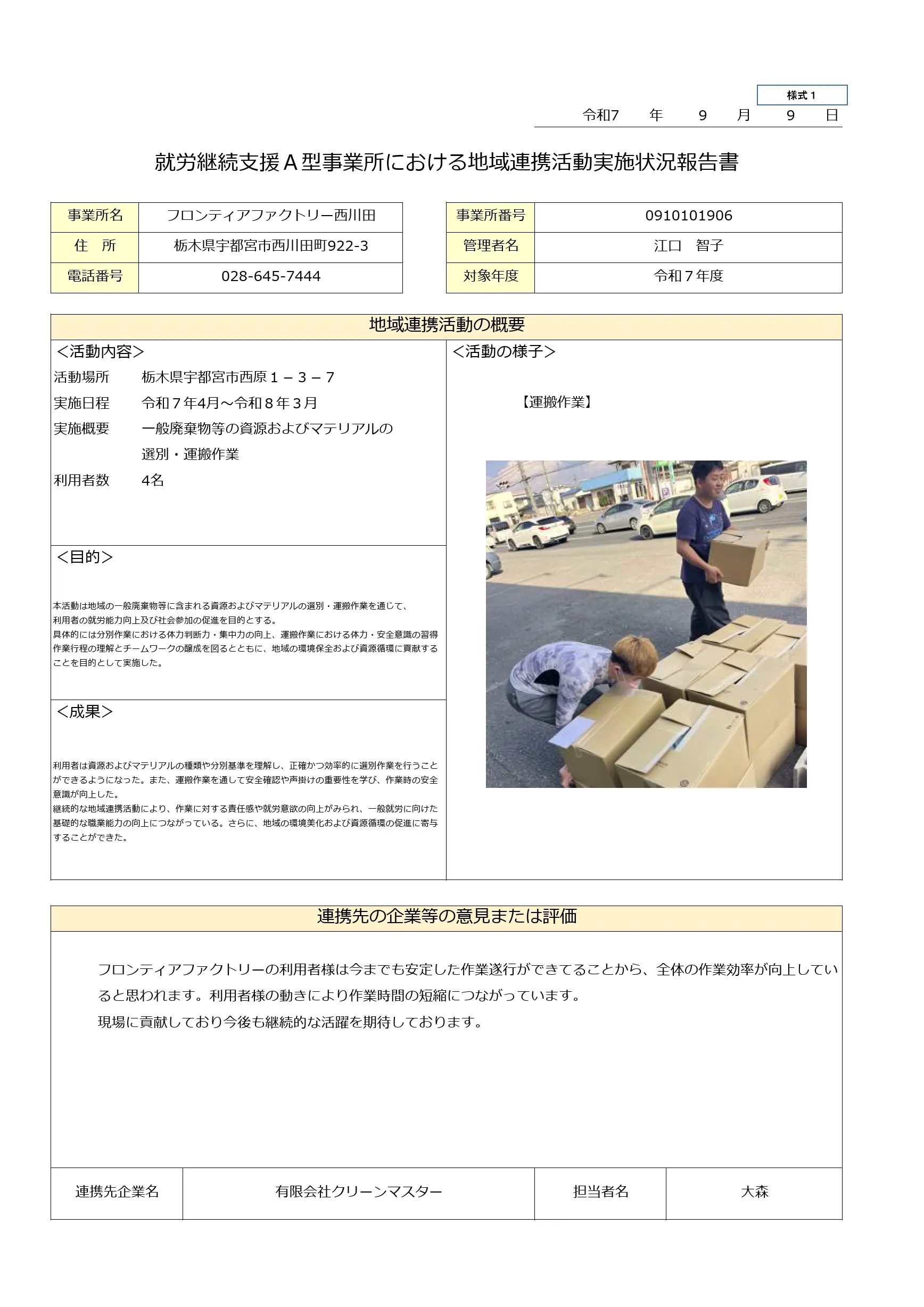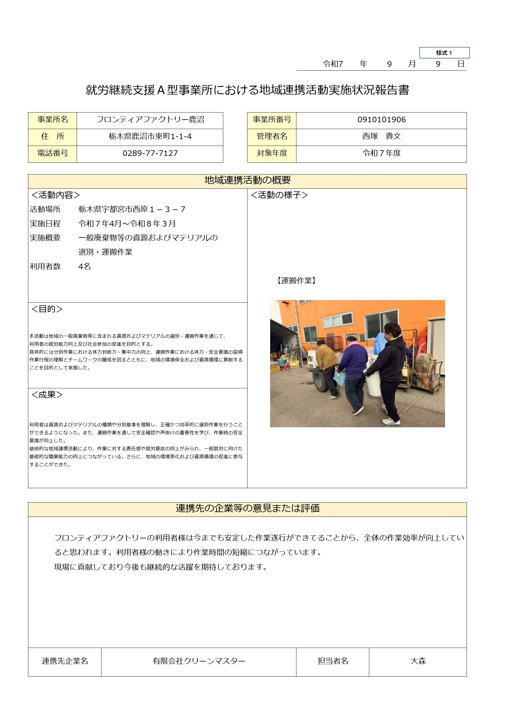 | 活動明細書:フロンティアファクトリー鹿沼 |