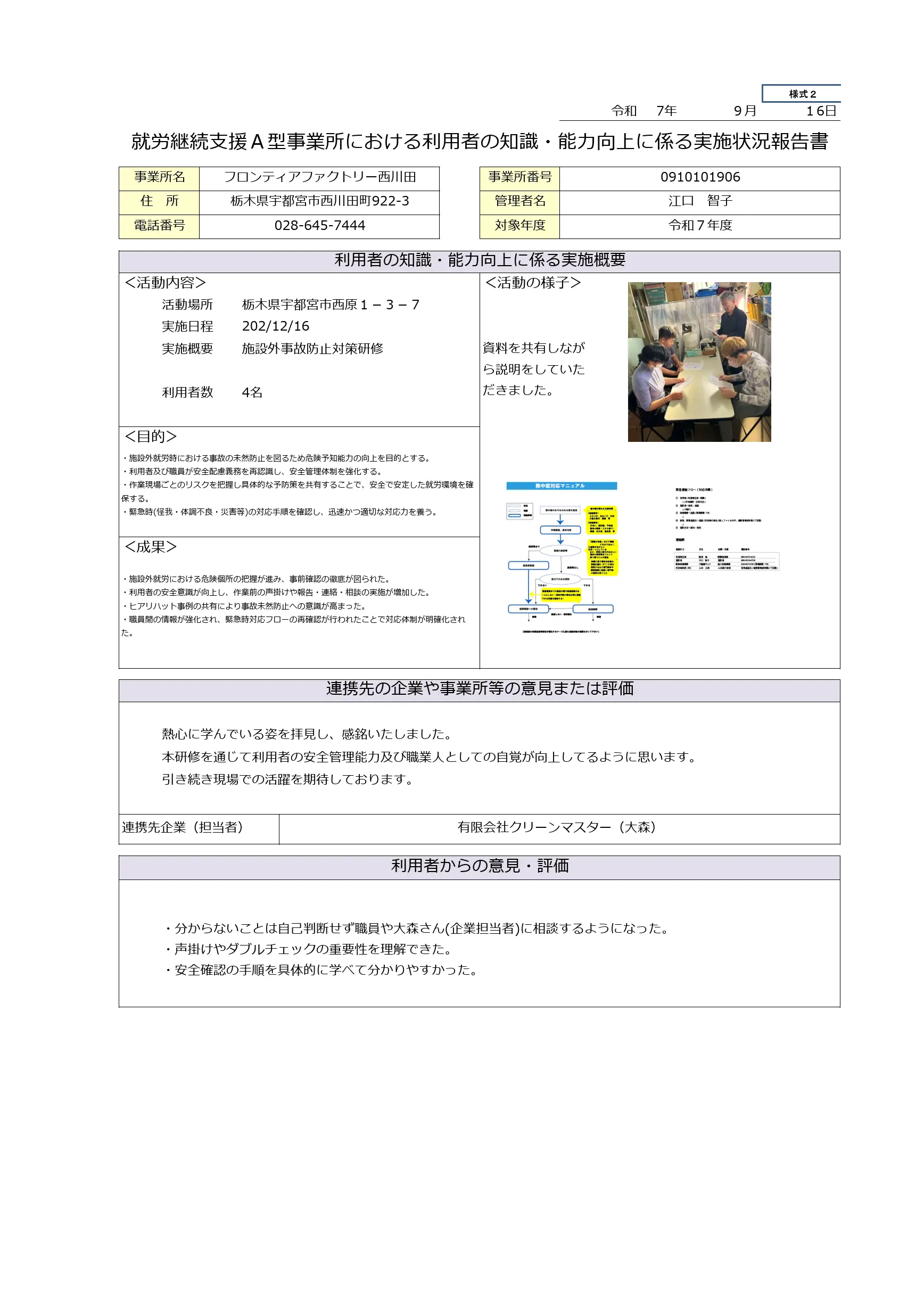 | (鹿沼)就労継続支援A型事業所における利用者の 知識・能力向上に係る実施状況報告書 |